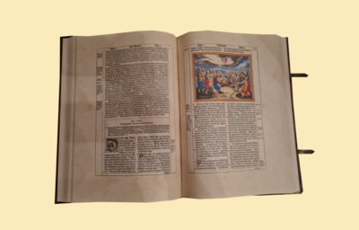 “Die wohl schönsten jemals geschaffenen Kupferstiche schmücken den Text dieses Codex des Neuen Testaments aus dem 17. Jahrhundert, der in deutscher Sprache in einer eleganten Frakturschrift gedruckt wurde. Er ist das Werk des berühmten Matthäus Merian d. Ä., der den großen Renaissance-Meister Albrecht Dürer in der Kunst des Kupferstichs vielleicht sogar übertroffen haben dürfte. Diese Farbstiche zeichnen sich durch ihre Kunstfertigkeit, Kreativität und Präzision aus und machen diese "Kupferbibel" zu einem besonders begehrten Exemplar der Drucke der Frühen Neuzeit."